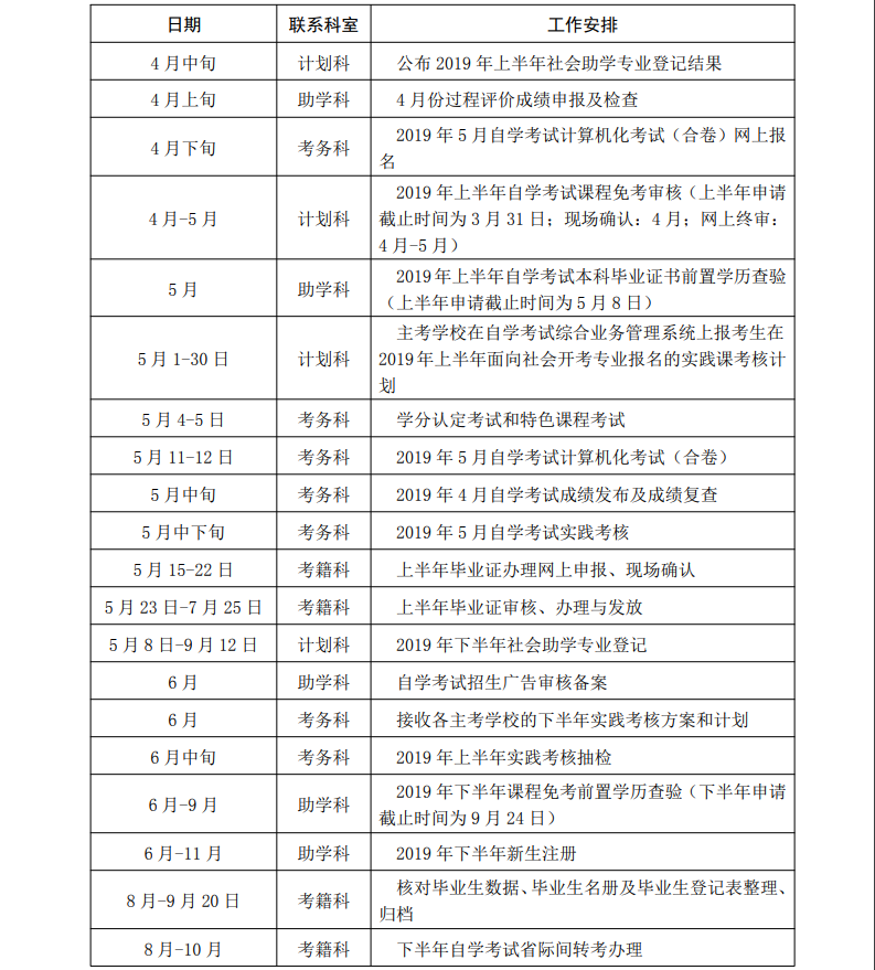 2019 年湖北省高等教育自学考试常规业务工作安排